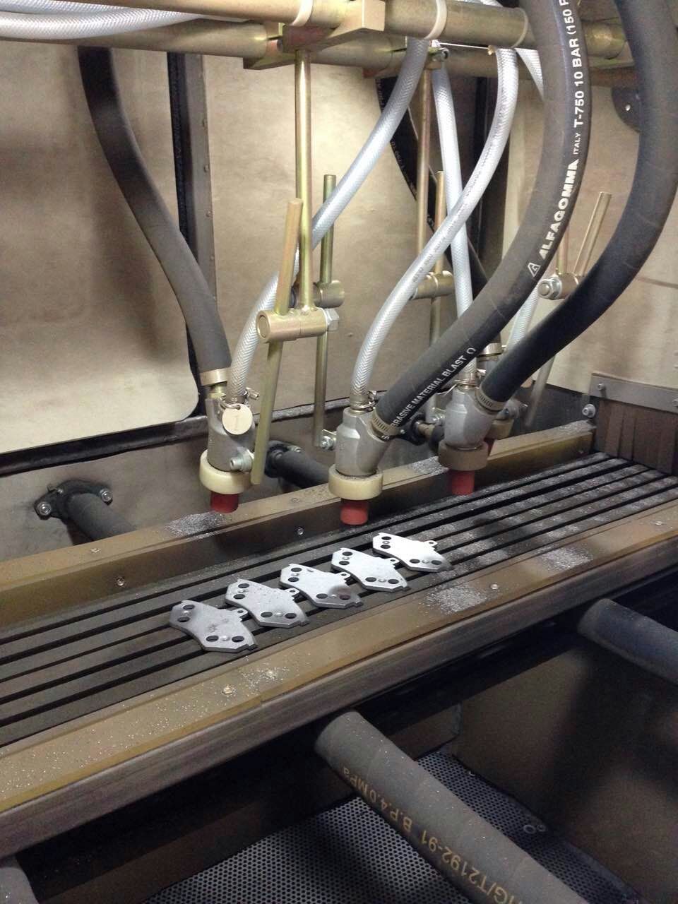 剎車片的生產過程中質量尤為關鍵,其中最重要的一個生產環(huán)節(jié),鐵才與剎車片雛形粘合,粘合前需要通過自動噴砂機,才能有效的粘合。